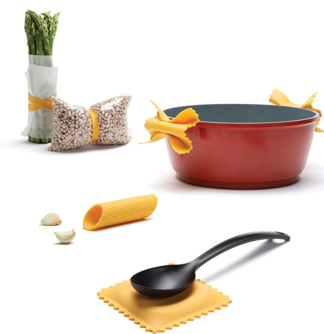 poggiamestolo , due presine , tre elastici da cucina, e sbuccia aglio in silicone